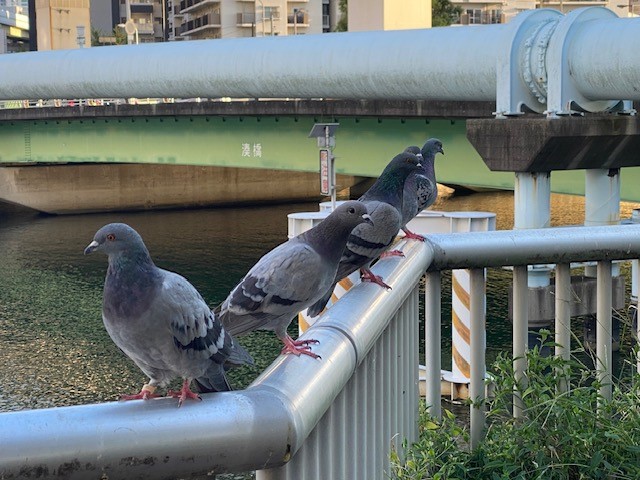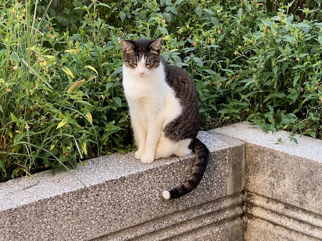 遊歩道ではハトが並んで休んでいます。ネコも気持ちがいいのか眠そうです。