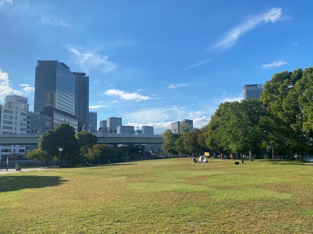 芝生広場は空が広く、対岸のビルとともにNYのセントラルパークのような雰囲気を感じさせます。