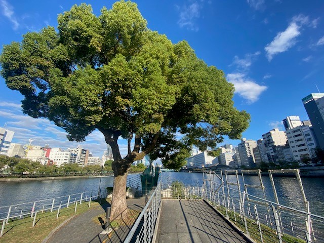 東の突端はオブジェもあり船の舳先のようです。立派なクスノキの先、川は京へと続いていきます。