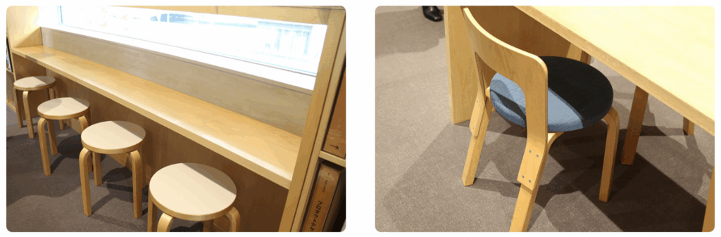 「もちろん、普通に座って本を読むスペースも設けています。そこにも、安藤先生のこだわりがあり、読書に集中できるように座り心地を重視するとともに、こどもたちに上質な家具に触れてほしいという想いから、Artek社のN65や、オリジナルスツールなどを選んでいます」
