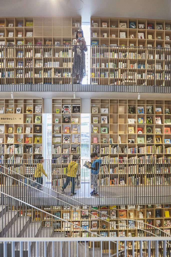 「こども本の森 中之島」を象徴する3フロア分の壁がすべて本棚は圧巻。★